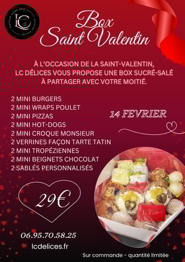 Cette année pour la St Valentin, offrez un cadeau qui sort de l'ordinaire : Notre box gourmande qui combine le meilleur des saveurs sucrées et salées pour ravir votre moment en amoureux !